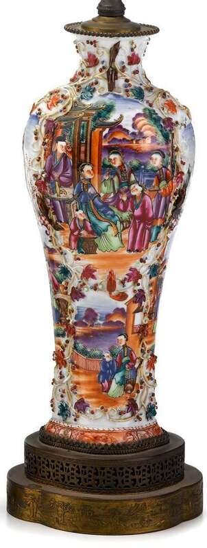 Of baluster form molded with leafy vine and squirrels, decorated with polychrome panels of figures at various pursuits, fitted as a lamp.