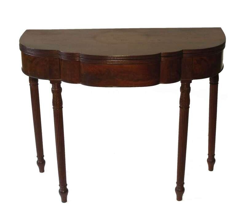 The elliptical shaped top with reeded edge on conforming apron and turned, leaf-carved and tapering reeded legs ending in peg feet.