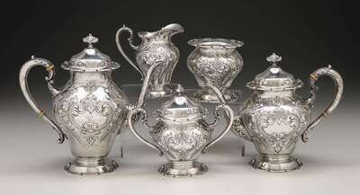 Five piece sterling silver repoussé coffee and tea service s. kirk & son, baltimore, md, early 20th century