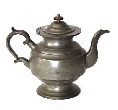 Squat urn form with ebonized finial to lid, molded midband on circular foot with lyre handle, unmarked.