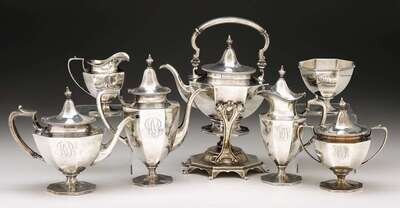 Comprising a hot water kettle on stand, a coffee pot, a teapot, hot water pot with hinged lid, creamer, covered sugar bowl, and waste bowl with beaded edge, paneled body, and octagonal base, all lids with urn finials, the base of the hot water kettle on outscrolled feet, monogram.