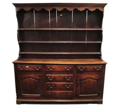 The upper section having a rectangular top with a molded edges and scalloped frieze with three shelves and flanked by shaped supports and the lower section having a rectangular top over three short drawers above three center drawers flanked by two panel doors on straight bracket feet.