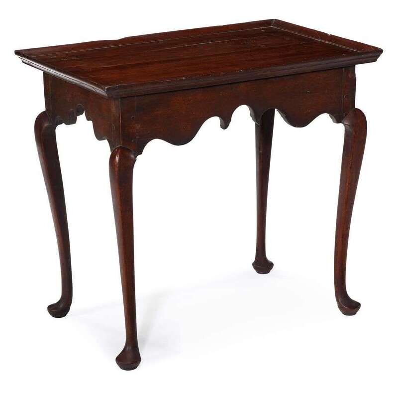 The rectangular tray top on a shaped apron and cabriole legs ending in pad feet.