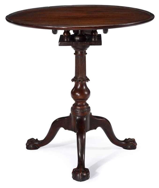 The dished top tilts on birdcage and fluted, ruffled and urn form support, on cabriole legs ending in ball and claw feet.
