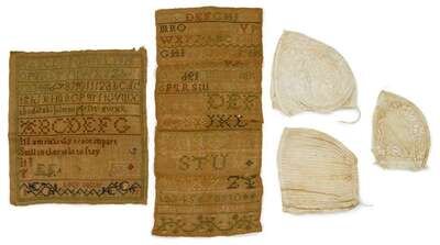The first sampler, by "Sarah Pearson June 28 1791," worked with alphabet and a strawberry border; the second, by "Lucy Salter," with alphabet and numerals, both worked with silk threads on linen grounds; together with three white worked baby caps, with notes, "This cap was made 1804. Worn by Dr. L.P. Coleman and all his children. L.P. born 1804"; "Cap made by Susan Howell for her sister Margaret Howell (Saltars) baby Lawrence born Nov 1811- Susan Howell Fenwick"; and "This cap made by Sarah B. Coleman worn by all herre babies-last baby Elizabeth born 1810-July First." A hand written geneology and geneological notebook of the family accompany lot.