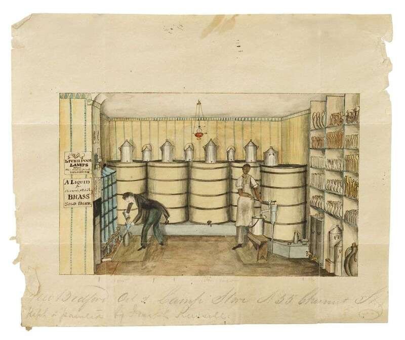 Inscribed in pencil, "New Bedford Oil & Lamp Store No 55 Chestnut St kept & painted by Joseph Russell," watercolor and ink on paper.