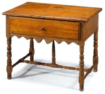 The rectangular molded top above a single molded edge drawer, scalloped apron and turned legs, joined by conforming stretchers.