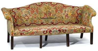 Camel back, serpentine front, roll arms on square blind fret carved legs, needlepoint upholstery.