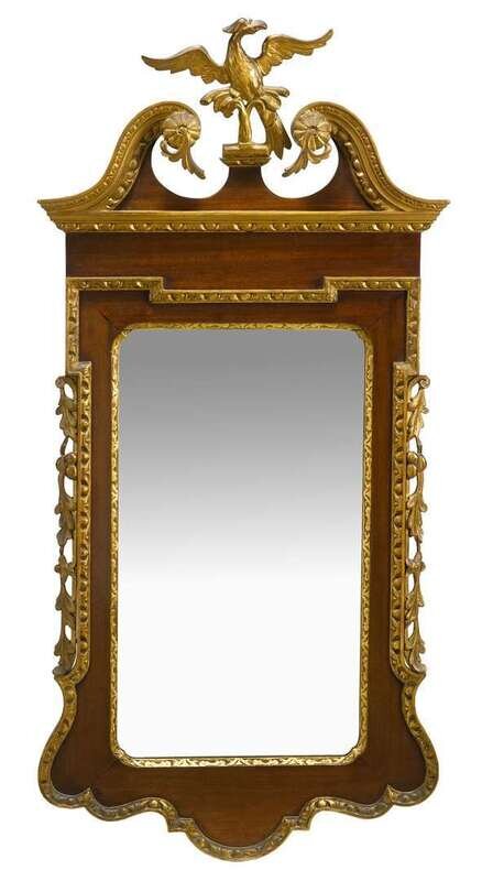 The scrolled cornice centering a phoenix above gilded molding and liner enclosing mirrored plate, flanked by fillets, shaped pendant below.