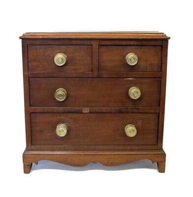 The molded rectangular top above two short drawers and two graduated drawers on a scalloped base continuing to bracket feet.