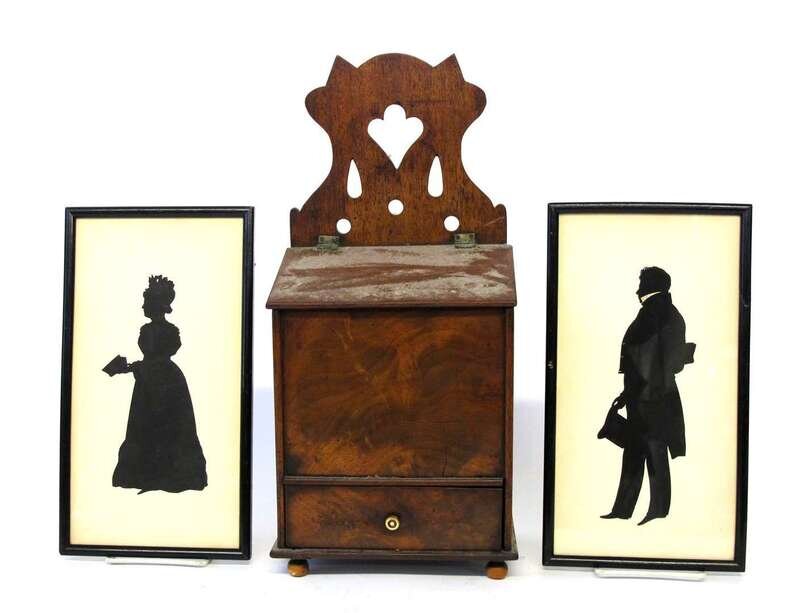 The shaped and pierced cresting above hinged lid on box with drawer having turned ivory pull; together with two silhouettes, the first a figure of a standing lady indentified on verso, "Katherine Stewart, daughter of John Stewart of Stenton and...wife of Thomas MacRitchie Mrs. MacRitchie of Lieth Perth 20th Sept 1831," and the second, a standing gentleman, identified on verso, "...Bayley Esq...of the...Community for the National School Edinburgh 30 July, 1830."