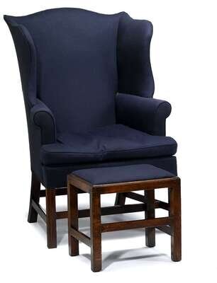 The serpentine crest enclosed by shaped wings and slightly outscrolled arms on molded legs joined by stretcher; together with an English mahogany stool .