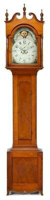 Slender molded double scroll cresting with turned rosettes and single urn and acorn finial, arched face door flanked by slender columnettes, moon phased face, black on white Arabic numeral chapter ring, subsidiary seconds ring, "Samuel Brenheisen" above a crescent date window, floral and cornucopia painted corners, rectangular cock beaded waist door, applied molded base panel, both waist and base have spiral carved quarter round fluted corners on straight bracket feet. .