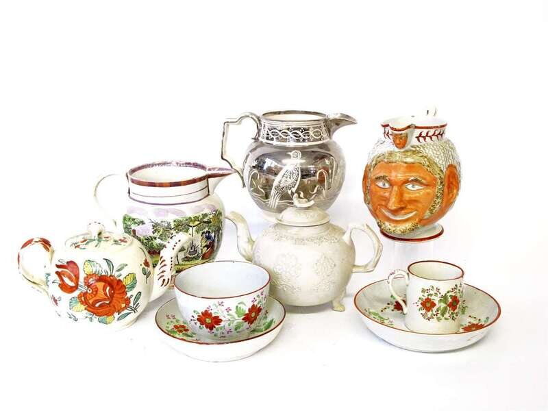 Including a molded spherical creamware teapot, silver lustre pitcher, pearlware mask pitcher, transfer printed lustre pitcher printed with "The Gypsies Pastime" and the "Farmer's Arms," and pearlware teabowl and saucer and cup and saucer, and a creamware teapot.
