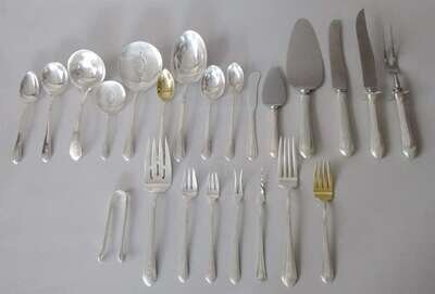 "Lady Diana" pattern comprising twelve dinner forks, twelve vermeil salad forks, twelve seafood forks, twelve hollow handle dinner knives, twelve flat handle butter spreaders, twenty-four teaspoons, twelve cream soup spoons, twelve vemeil fruit spoons, one tomato server, one bon bon spoon, two serving spoons, one gravy ladle, one pair of sugar tongs, one sugar shell, one serving fork, one lemon fork, one pickle fork, one salad serving spoon, one jelly spoon, one hollow handle pastry server, one hollow handle carving set, and one hollow handle cheese serving knife; together with a Gorham butter pick, monogram.