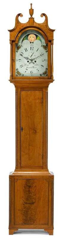 Slender double scroll cresting with turned rosettes and an urn finial, arched face door flanked by slender columnettes, painted moon-phased face with black on white Arabic numeral chapter ring, subsidiary seonds ring with curved date window, "Henry Ober Elizabeth Town" in script, floral painted corners, rectangular cockbeaded waist door flanked by rope carved quarter round corners, base with molded framed panel flanked by rope carved quarter round corners on straight bracket feet. 1.