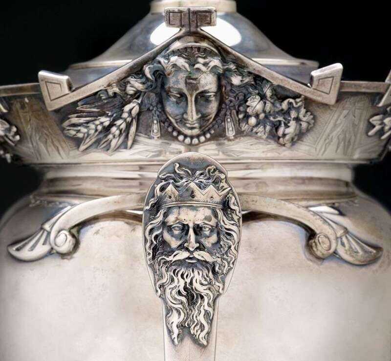 Comprising hot water kettle on stand, teapot, covered sugar bowl, creamer, and waste bowl; each of urn form, the lids with heraldic lion finials, the shaped rims bearing masks and festoons with geometric chasing, the angular mounted handles with masks, and the circular bases with leaf chasing, monogram. The teapot with ivory insulators and male mask on underside of spout, the hot water kettle with putto stopper, retailed by Bailey & Co.