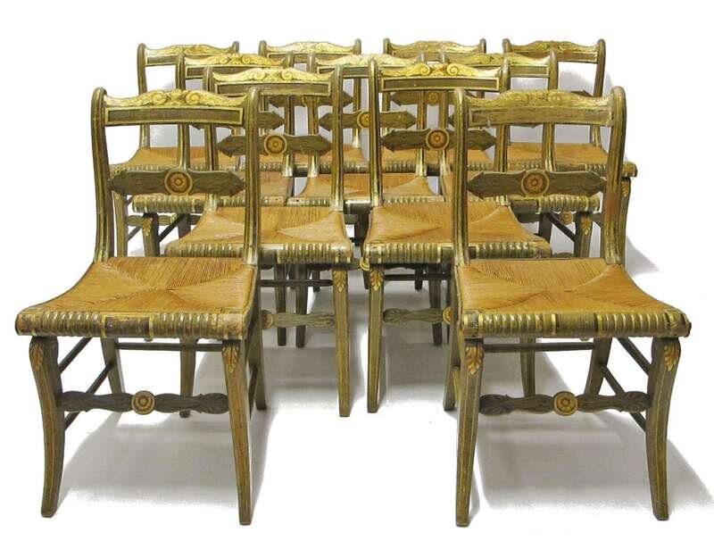 Eleven green and gold painted rush seat Fancy side chairs circa 1820
