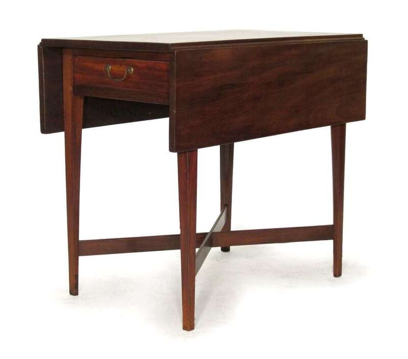 Rectangular top with conforming leaves, frieze fitted with single drawer, tapering legs joined by stretchers.