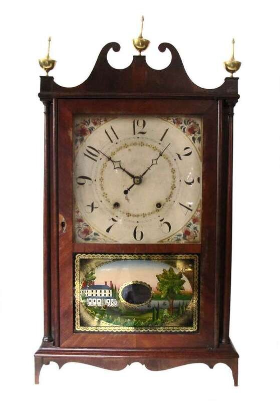 Of typical form with three brass urn form finials on broken cresting, painted face above an eglomisé panel with large house and river, tall bracket base, retains most of printed label.
