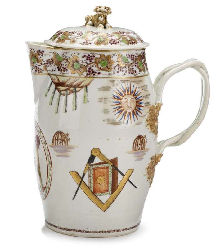 The jug decorated with polychrome Masonic devices, the lid and border decorated with grapevines.
