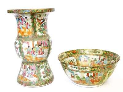 Chinese Export porcelain Rose Medallion punch bowl and Gu-form vase early 19th century