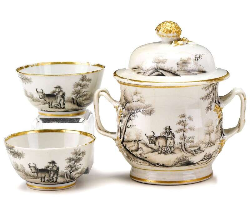 Comprising two teabowls and a twin-handled covered sugar bowl, each painted in grisaille with a farmer, his cow and his dog in a pastoral setting, all with gilt edged rims.