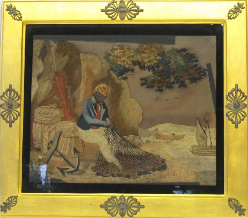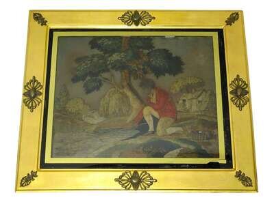 The first depicting a young man fishing by a stream, the second depicting a fisherman with a net, both worked with polychrome wool yarns and paint on fabric ground, gilt frames.