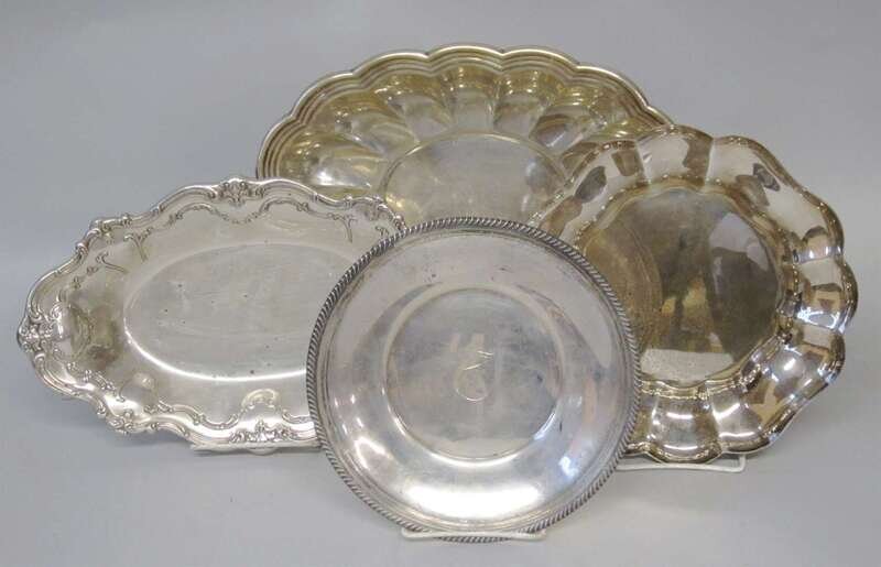 The first of oval form having a threaded scalloped edge and lobed body, the second of oval form with cartouche decorated handles; together with Gorham sterling silver circular plate with a gadrooned edge and an S. Kirk & Son square sterling silver tray with a shaped edge and body, some with monograms.