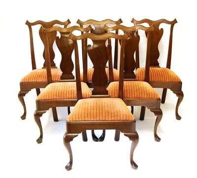 Comprising two armchairs and six side chairs having a shaped crestrail above a vasiform splat, cabriole leg, and slipper foot.