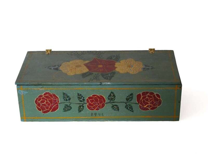 Amish painted and decorated trinket box attributed to leah lapp, lancaster county, dated "1941"