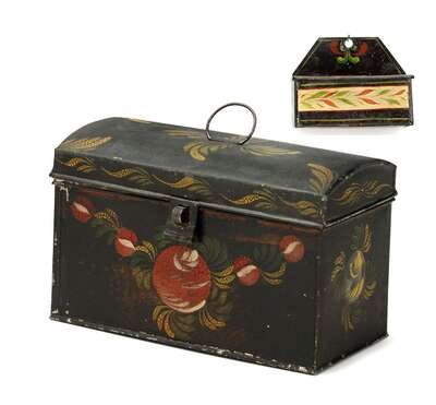 Painted and decorated tinware document box and hanging match box 19th century