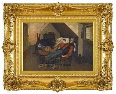Joseph F. Reynolds (1861-1925) cottage interior with sleeping figures