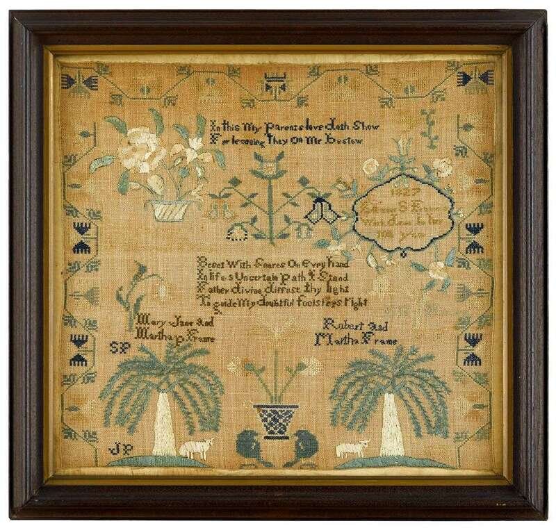 A meandering flower vine enclosing potted flowers, trees, inscription and names and initials of family members, worked with polychrome silk threads on a linen ground, ribbon border, framed.