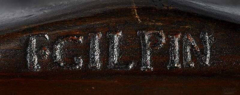 Branded "T. Gilpin," the cresting with carved volutes above nine spindles, flattened back rest and shaped handholds on vase turned supports, D-shaped seat on vase and ball turned legs joined by turned stretchers.