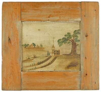 Recessed panel painted with landscape including a long fenced road, church, and tree with other houses beyond.