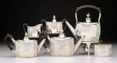 Comprising a hot water kettle on stand, a coffee pot, teapot, covered sugar, creamer, and waste bowl. All of oval form with a slightly paneled body, and urn finials, monogram.