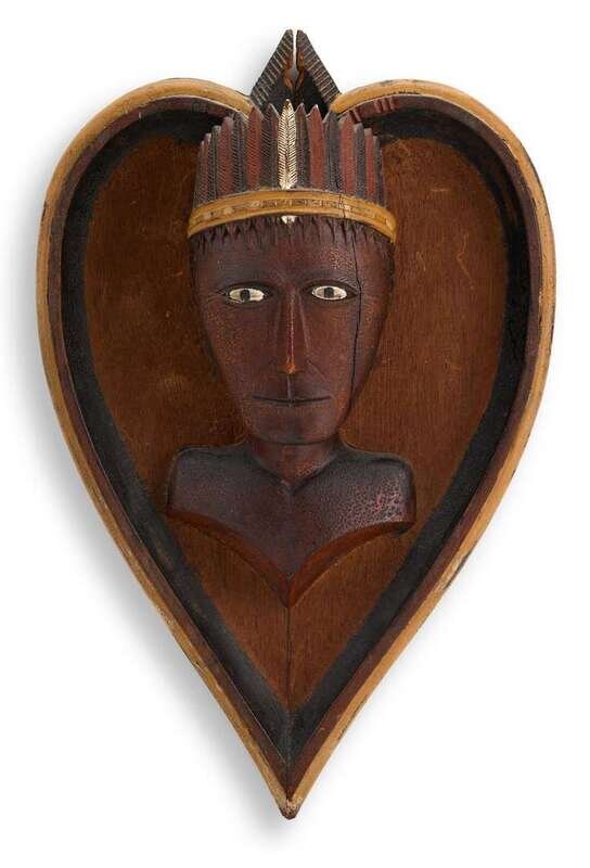In the form of an American Indian's head wearing feather headdress on a molded heart-shaped backboard.