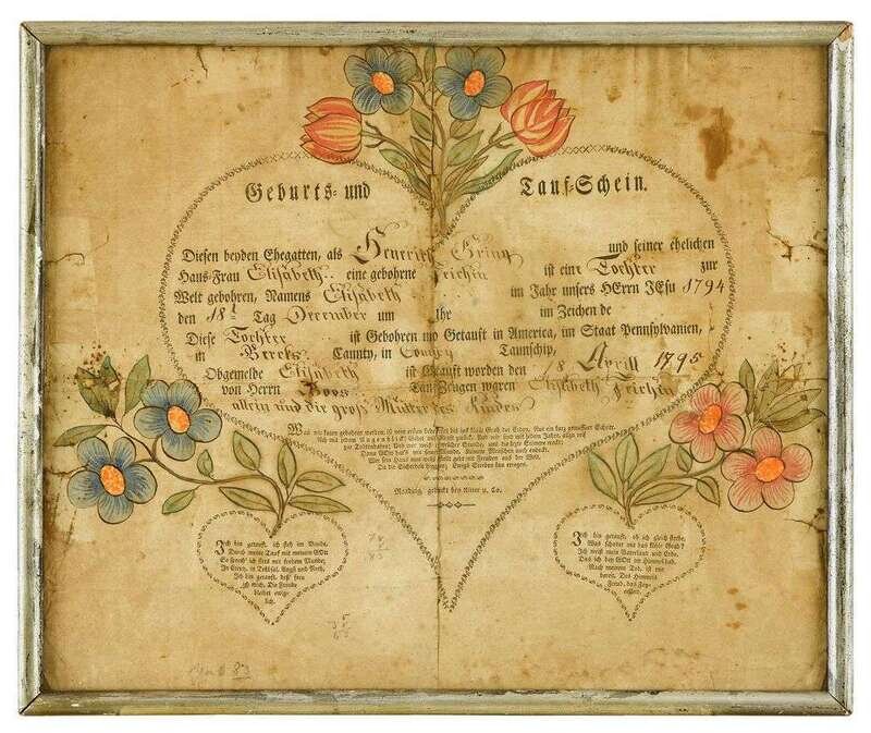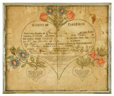Fraktur: Birth and baptismal record of Henerick Gring of Berks County johann ritter, reading, pa, dated 1795