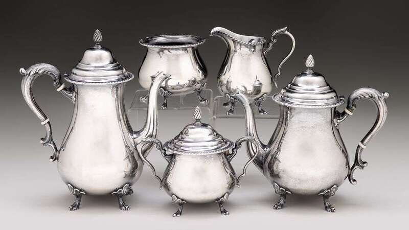 All of pyriform comprising a coffeepot, teapot, a twin-handled covered sugar, all with a stepped domical hinged lid with flame finial; a creamer with gadrooned rim and scroll handle; and a waste bowl with gadrooned rim, all on four paw feet. .