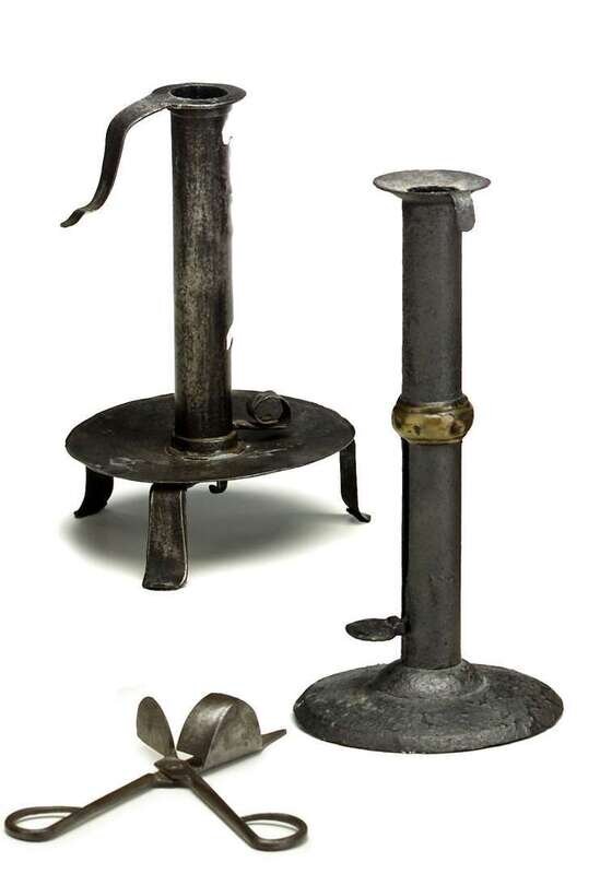 Including a "wedding ring" hogscraper candlestick, a footed candlestick with finger hold and a pair of scissors snuffer.