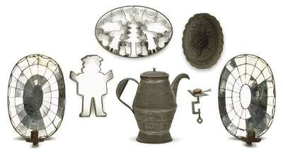 Including a pair of mirrored oval candle sconces, a coffeepot, mold, large figural cookie cutter of a man, an oval cookie cutter enclosing many forms, and a sewing bird.