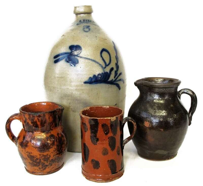 Including redware cann and pitcher, both with manganese splotches, a redware pitcher with brown glaze, and a cobalt decorated stoneware jug, impressed, "C. Hart. Sherburne."