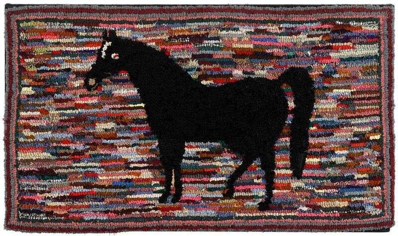 Rectangular form with black horse on a polychrome field, mounted for hanging.