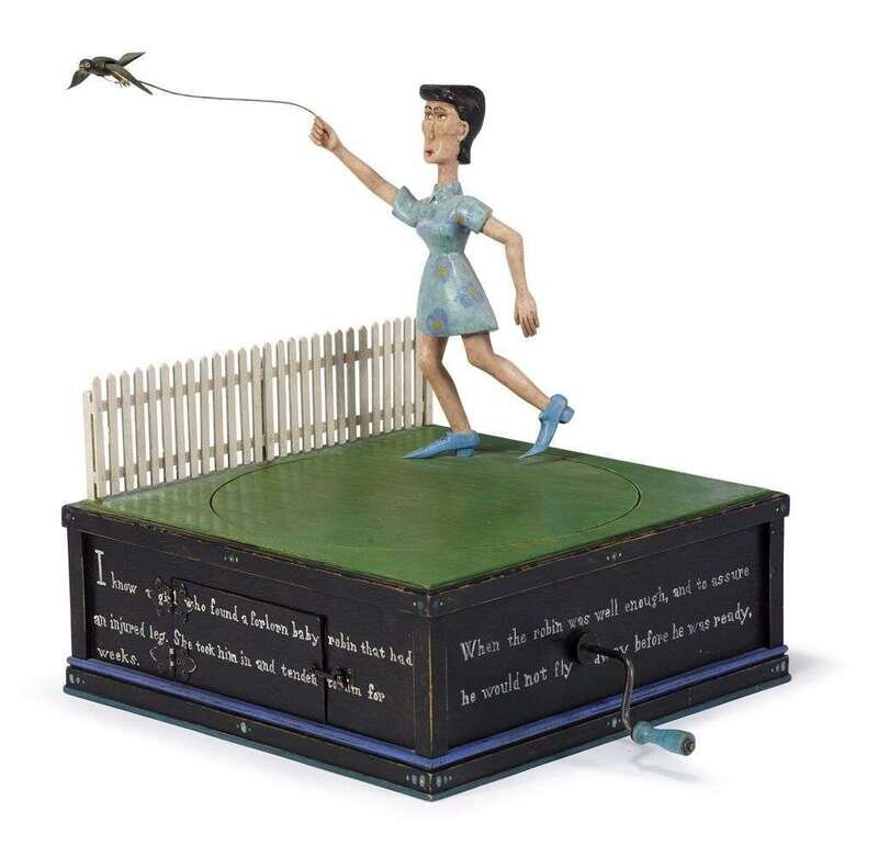 Signed "Tom Harvey 01," the figure of a woman with bird on a string moves on platform when crank is turned on box inscribed, "I knew a girl who found a baby robin that had an injured leg. She took him in and tended to him for weeks. When the robin was well enough, and assured he would not fly away before he was ready she tied a string around his good leg and gently "flew" him around her yard. When she was certain he was able she set him free."