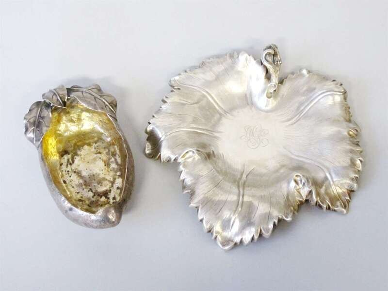 Of leaf form with a curved stem handle; together with another hammered sterling silver candy dish of pod form with appllied foliage and stem handle.