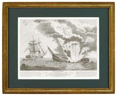 Engraving "explosion of the british frigate guerriere...after her capture by the u.s. frigate"