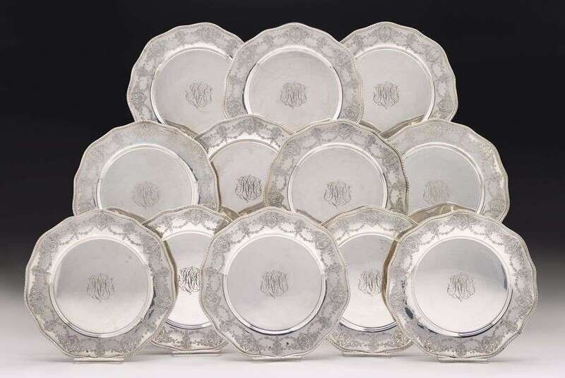 Twelve sterling silver plates f.m. whiting co., north attleboro, ma, early 20th century