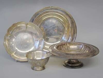 Including a small Stieff "Revere" style bowl, a Grogan floral form bowl, a large Towle bowl, and a chased footed bowl, some with monogram.