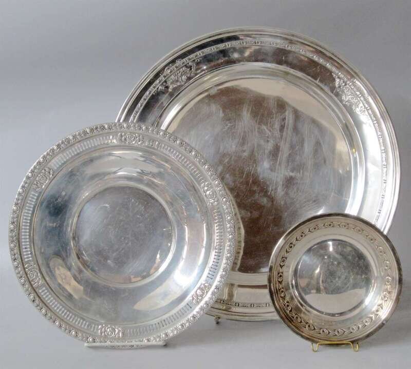 Of circular form in the "Lady Constance" pattern; together with a sterling silver plate in the "Royal Rose" pattern and a small Reed & Barton sterling silver dish.
